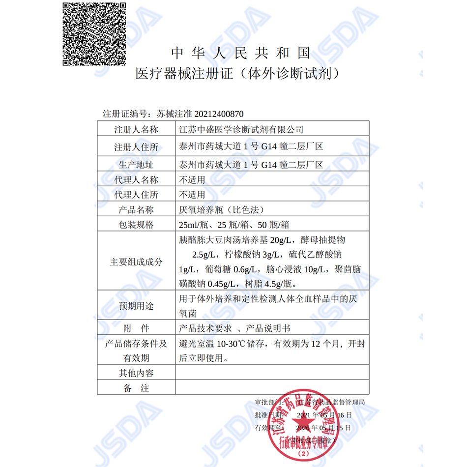 醫(yī)療器械注冊證(體外診斷試劑)-厭氧培養(yǎng)瓶(比色法)